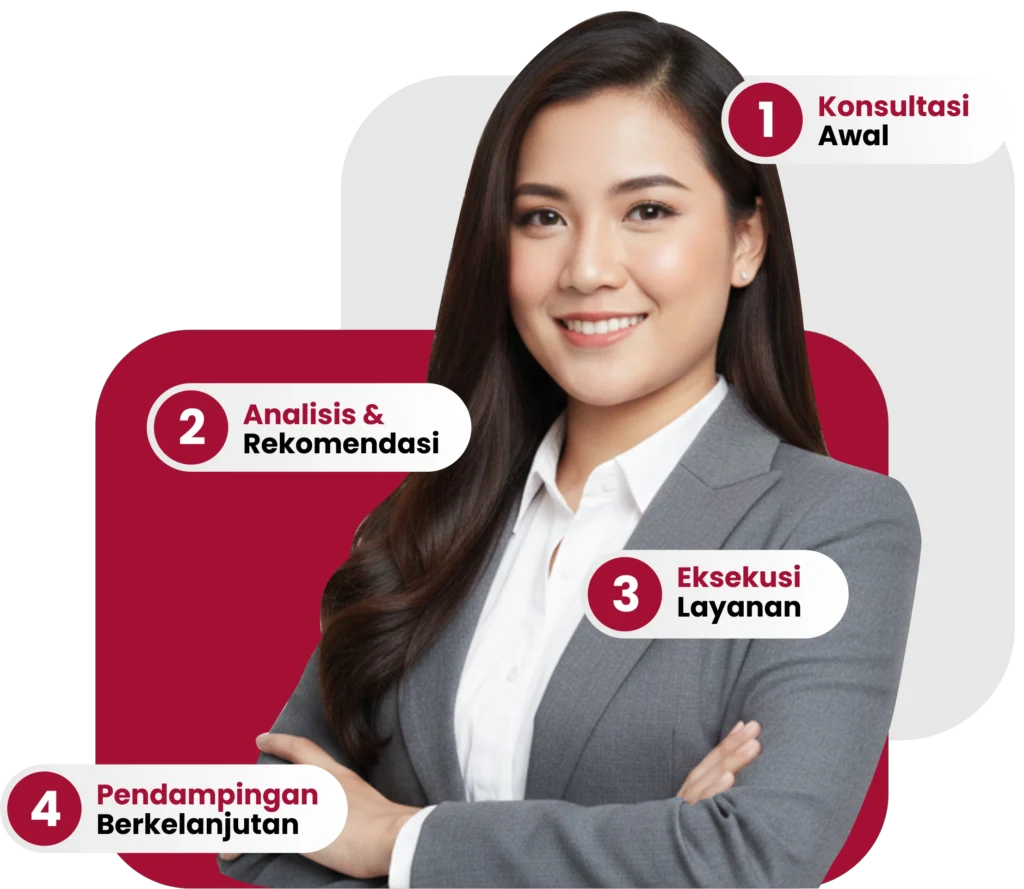 Kami menjalankan setiap layanan dengan empat pilar proses yang terstruktur. Fokus kami adalah memahami masalah Anda secara mendalam, merancang solusi yang tepat guna, dan menjamin kepatuhan jangka panjang.